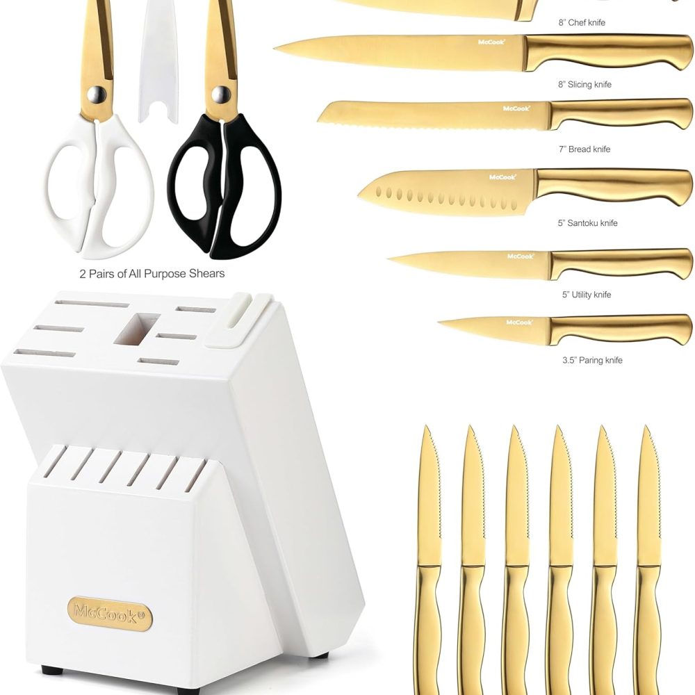 Introducing the McCook® Golden Titanium Stainless Steel Kitchen Knife Block Set, a premium collection of high-quality knives designed to elevate your culinary experience. Crafted with precision and innovation, this set is a must-have for any home chef or cooking enthusiast. This exquisite knife set features durable stainless steel blades coated in luxurious golden titanium for…